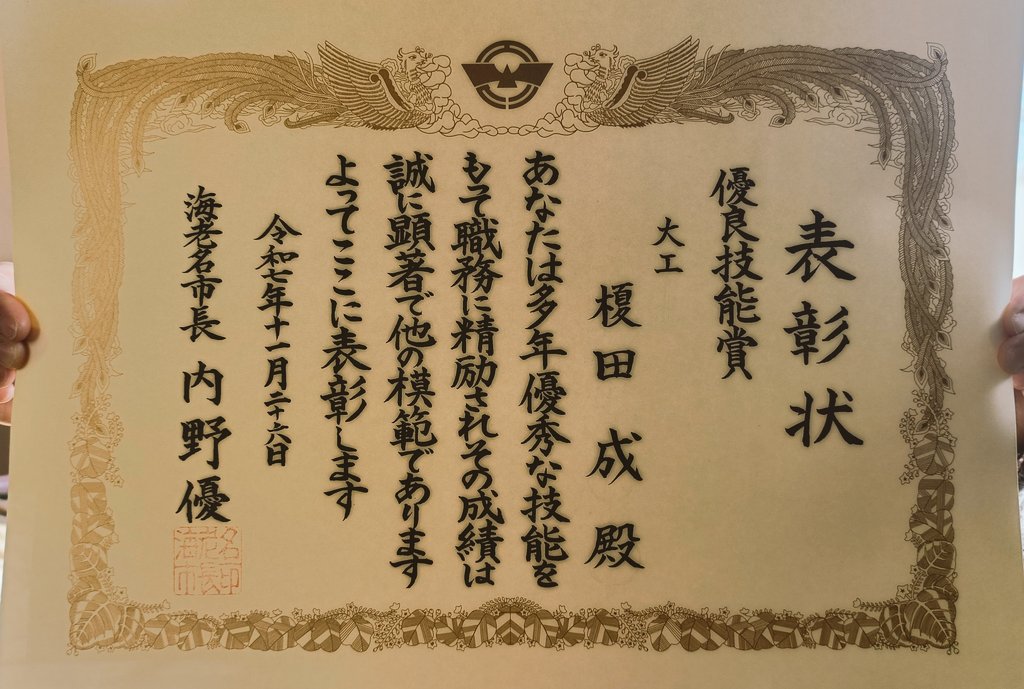 11月26日に海老名市役所にて開催された海老名市・海老名商工会議所主催「令和7年度 商工・労働部門表彰式」において、有限会社榎田工務店 代表取締役・榎田 成(さだむ)が「優良技能者」として表彰されました。