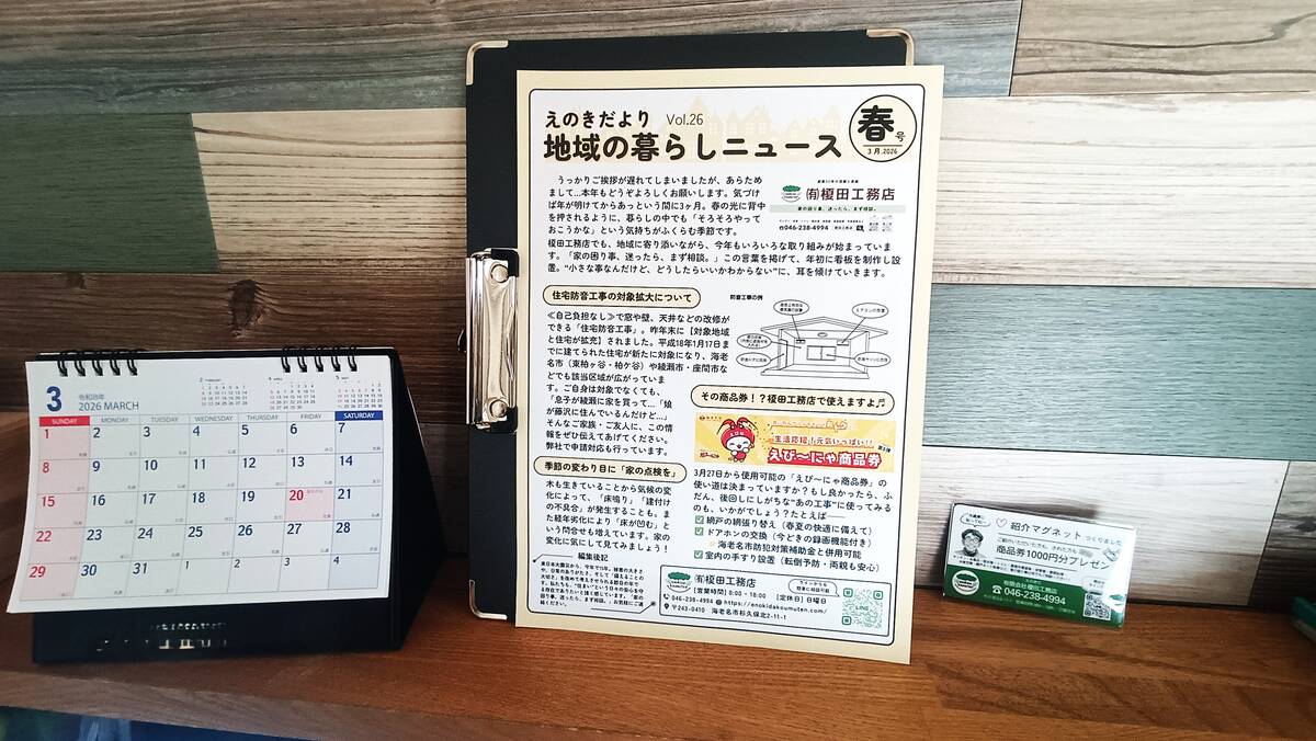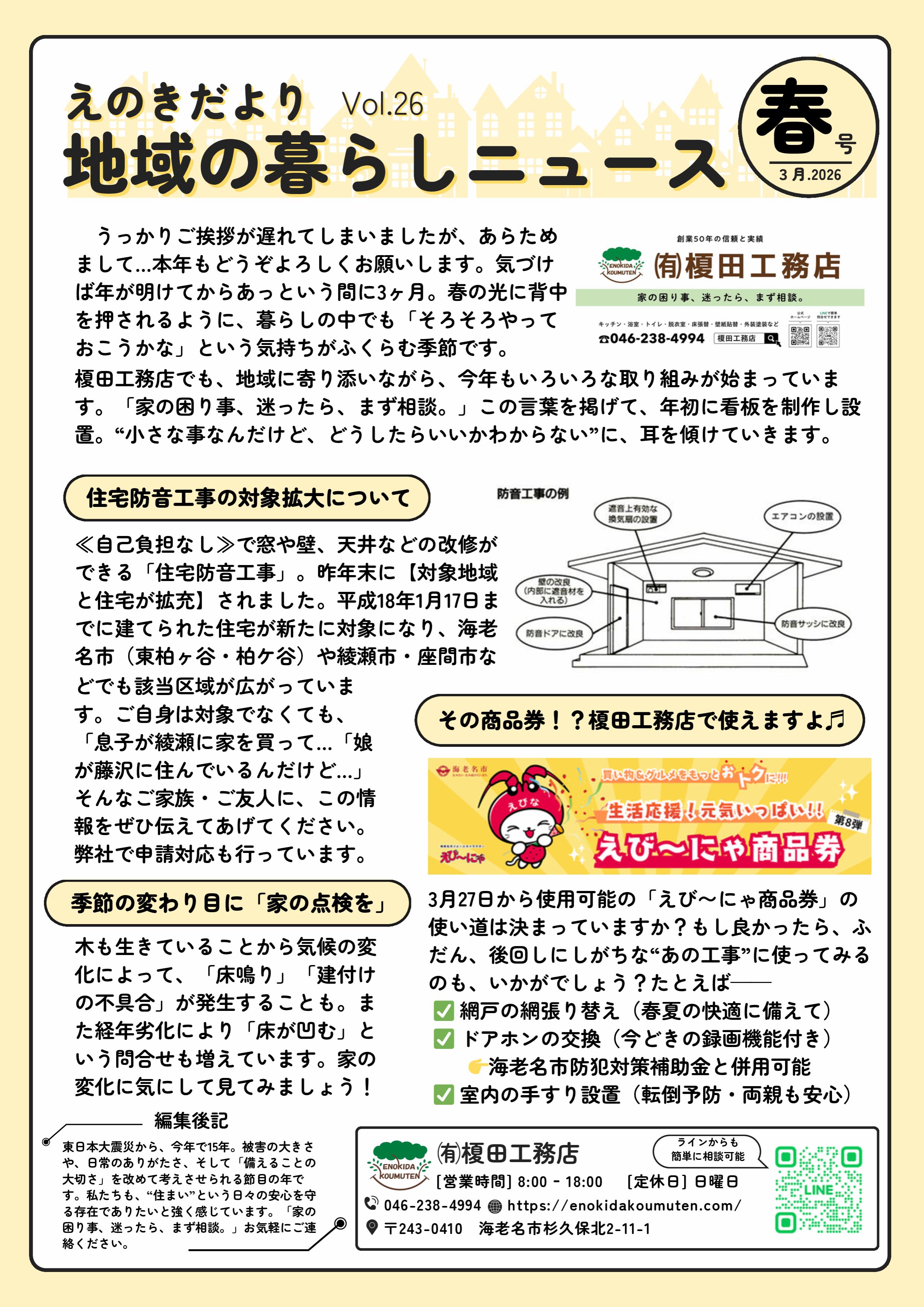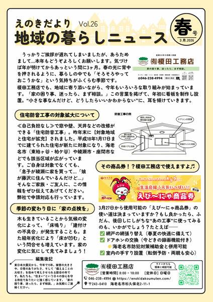 春の光に背中を押されるように、暮らしの中でも「そろそろやっておこうかな」と感じる季節になりました。榎田工務店では、地域に寄り添いながら、今年もさまざまな取り組みが始まっています。今号では、防音工事の最新情報や商品券の活用方法、住まいの見直しのヒントなどをお届けします。