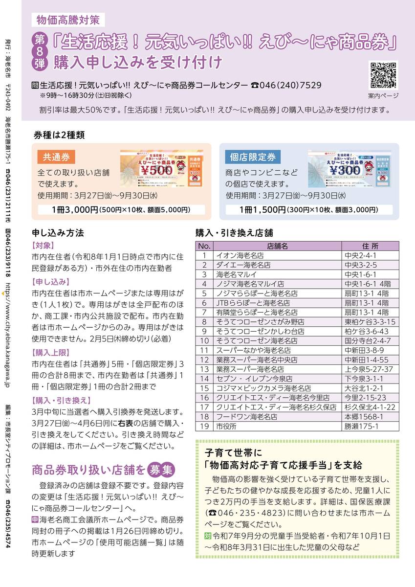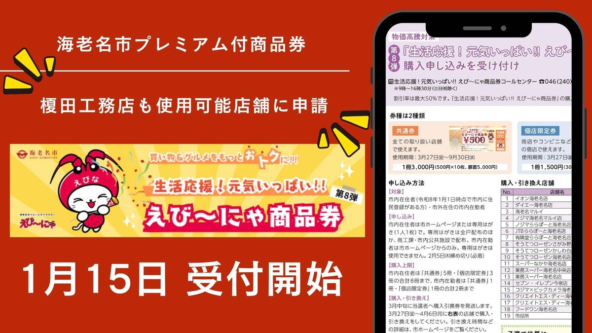 海老名市が発行するプレミアム付き商品券「生活応援!元気いっぱい!! えび~にゃ商品券(第8弾)」の申込みが、2026年1月15日より開始されました。本事業は、広報えびな(1月15日号)にも掲載されており、海老名市として周知を進めている生活応援施策です。