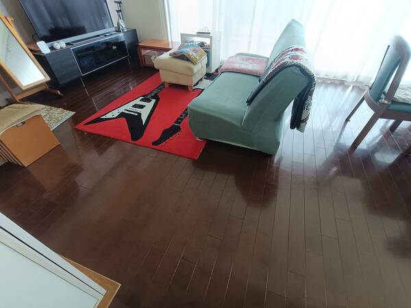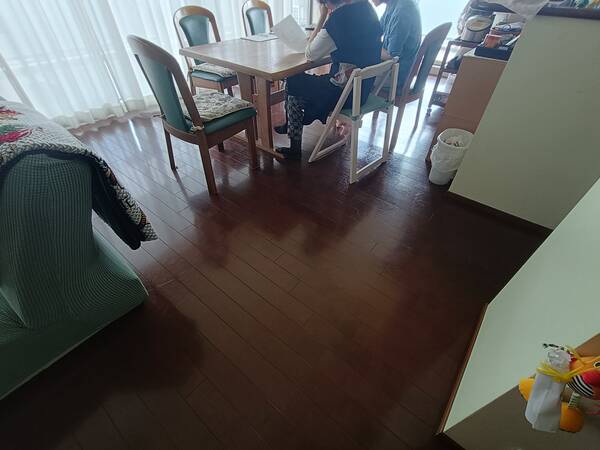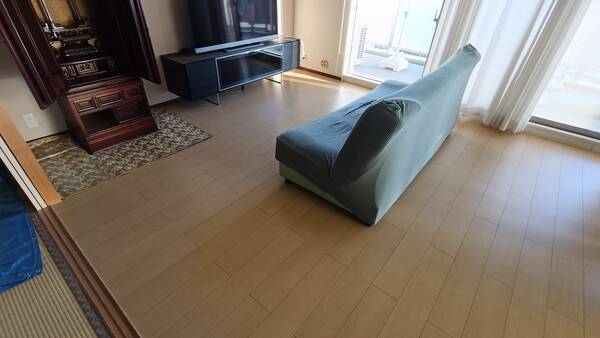 落ち着いた質感と耐久性のある床材で、リビング全体が明るく、快適な空間になりました。